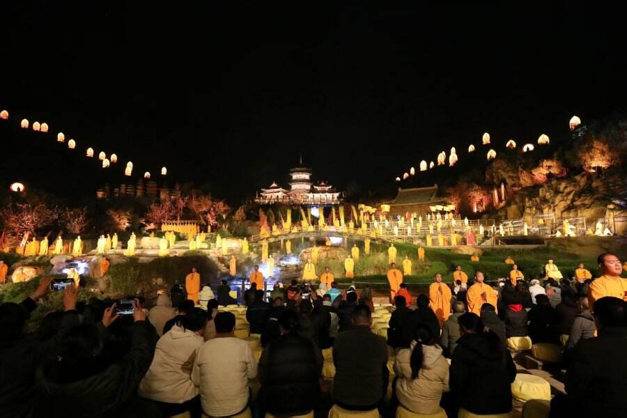 当暮色漫过嵩山少室山的轮廓,观众坐在露天剧场,山风带着草木的气息扑面而来,一场以禅宗文化为主题的大型户外实景文化演出《禅宗少林?音乐大典》开始了。“身似菩提树,心如明镜台。时时勤拂拭,莫使染尘埃……”伴随着歌声吟唱,演员们的身影渐渐浮现。