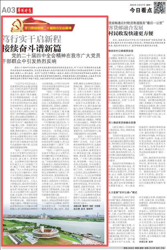 “习近平总书记在全会上的重要讲话和全会通过的《建议》,为我们在新时代新征程上推进各项事业发展指明了前进方向、提供了根本遵循。作为市委督查战线的一员,把学习贯彻全会精神落地转化为务实求效的具体行动,既是沉甸甸的责任,更是奋进的号角。”市委办公室督查一室主任许北平表示,将带头当好“宣传员”,深学细悟全会精神核心要义,把全会提出的新要求、市委落实的新举措转化为督查工作的“任务书”,确保督查方向不偏、靶心不移。将紧盯落实当好“督导员”,对标对表全会部署,聚焦市委中心工作,明确督查重点、压实督查责任,确保党中央决策部署在我市不折不扣落地见效,为郑州在奋力谱写中原大地推进中国式现代化新篇章中挑大梁、走在前提供坚强督查保障。