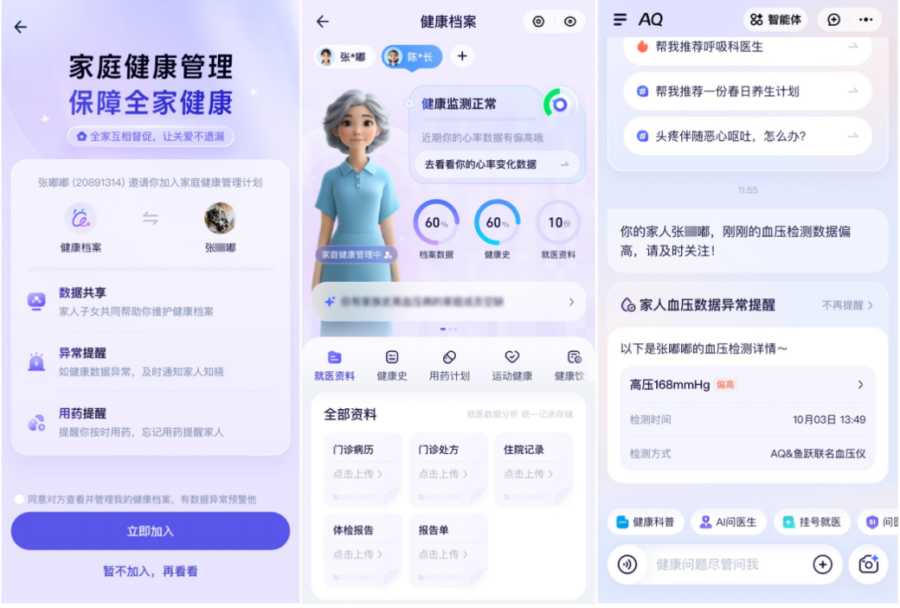为帮助解决这些问题,围绕老年慢病健康管理,AQ推出了多项功能:拍一拍血压计、血糖仪即可智能解读数据,像医生能追问,并支持健康数据异常的即时预警;与鱼跃联合推出AI血压计,可自动同步数据并生成健康周报,便于血压长期管控;推出慢病用药提醒功能,父母和子女都会定时收到通知,减少忘吃漏吃,避免病情反复;支持健康档案共享给家人,父母的病历和体检报告,子女随时能看、能管、能提醒…通过技术让子女即使身处异地,也能为父母的健康筑起“防护网”,让重阳节的关怀不止于节日,更融入日常慢病管理的每一个细节。