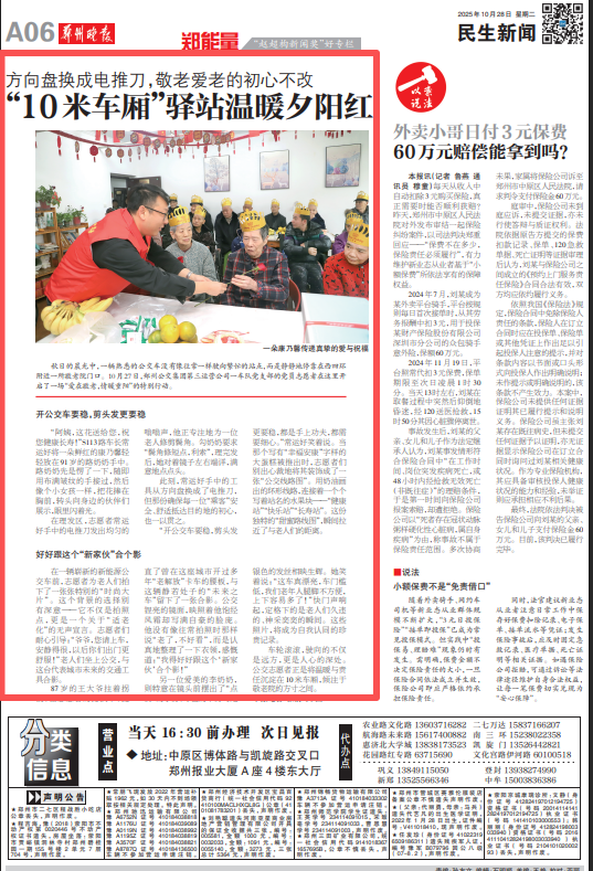 秋日的晨光中,一辆熟悉的公交车没有像往常一样驶向繁忙的站点,而是静静地停靠在西四环附近一所敬老院门口。10月27日,郑州公交集团第三运营公司一车队党支部的党员志愿者在这里开启了一场“爱在敬老,情暖重阳”的特别行动。
