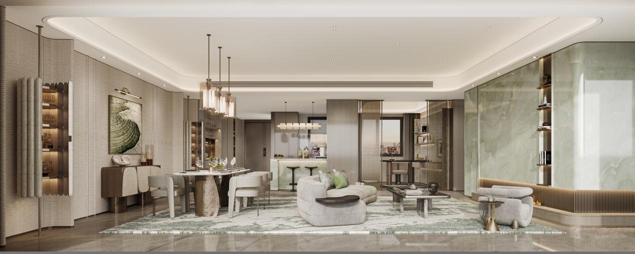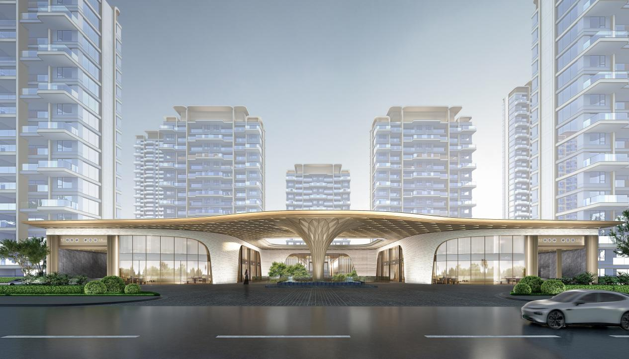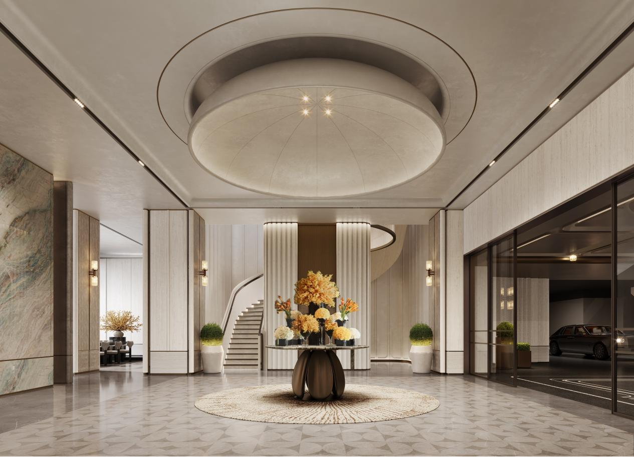 雲启主张归家是从社会角色到家庭自我的尊崇过渡,归家仪式应以人的使用角度实现设计。约110米城市级门厅,约7.8米高度,环岛落客区高定“生命之树”,通过约288块手工菱形板、约595块斧凿石材、约389块吊顶围合出静谧落客空间。地下归家空间则打造高新首个中央车站,串联城市与会所的生活动线,赋予归家身心双重尊崇。