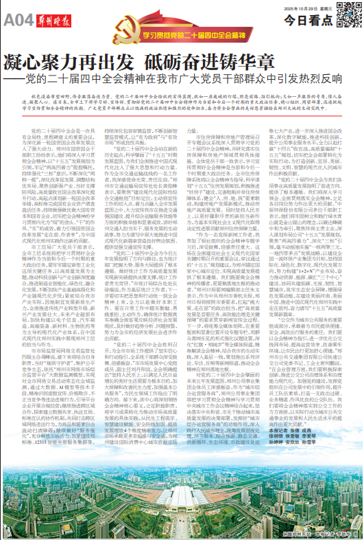 秋色浸染希望田野,伟音激荡奋进力量。党的二十届四中全会绘就的宏伟蓝图,犹如一座巍峨的灯塔,照亮前路、指引航向;又如一声激昂的号角,催人奋进、凝聚人心。连日来,全市上下将学习好、宣传好、贯彻好党的二十届四中全会精神作为当前和今后一个时期的重大政治任务,精心组织、周密部署,迅速掀起学习宣传贯彻全会精神的热潮。广大党员干部群众正以饱满的政治热情和强烈的使命担当,奋力将全会擘画的美好愿景描绘在郑州大地的生动实践中。