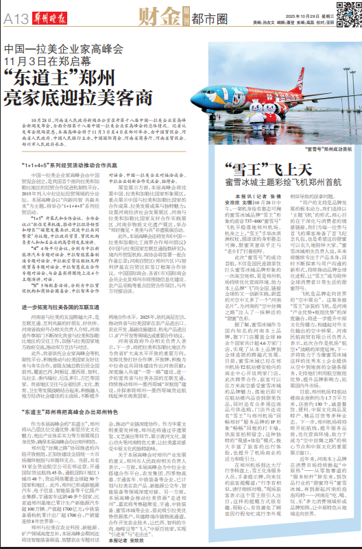 关于本届高峰会对郑州产业发展的意义,郑州市人民政府相关负责人表示,一方面,本届高峰会为中拉企业搭建合作平台,农发集团、四季物流港、宇通客车、中铁装备等企业,已计划与拉美在农产品、新能源公交车、智能装备等领域深度对接。另一方面,本届高峰会推动拉美资源“走进郑州”,嘉宾将考察超聚变、宇通、中铁装备、蜜雪冰城等企业,借此吸引拉美优势资源落户,共建跨境冷链物流通道,合作开发农业技术,让巴西、智利的牛肉、咖啡豆等“飞入”中原百姓家,实现“引进来”与“走出去”。