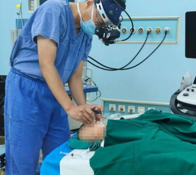 情况危急,刻不容缓。眼科迅速联系麻醉科、介入手术室,启动多学科联动。经过紧张筹备,患儿在全麻下接受“间接检眼镜下视网膜激光光凝术”,以干预组织视网膜脱落,保全视力。这台手术由眼科主任荣军博主刀。由于患儿瞳孔极小,视网膜极其脆弱,血管纤细,手术操作空间极为有限,对医生的精准度和稳定性提出了极高要求。在手术中,荣军博手持激光探头,在视网膜无血管区精准施以近千个激光光凝点,有效抑制了异常血管的增殖。整台手术持续数小时,直至当晚7点多才顺利结束。