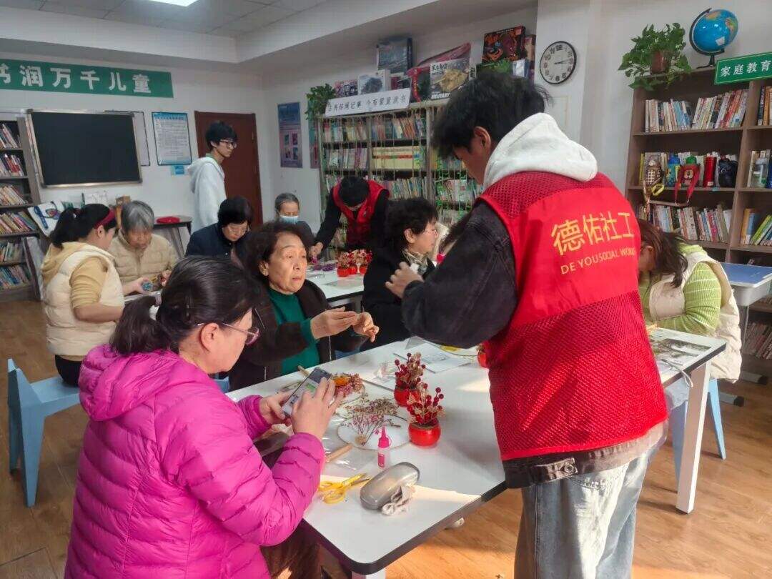 社工与志愿者们对动手不便的老人手把手协助调整花材位置、控制胶水用量,及时帮大家解决难题。