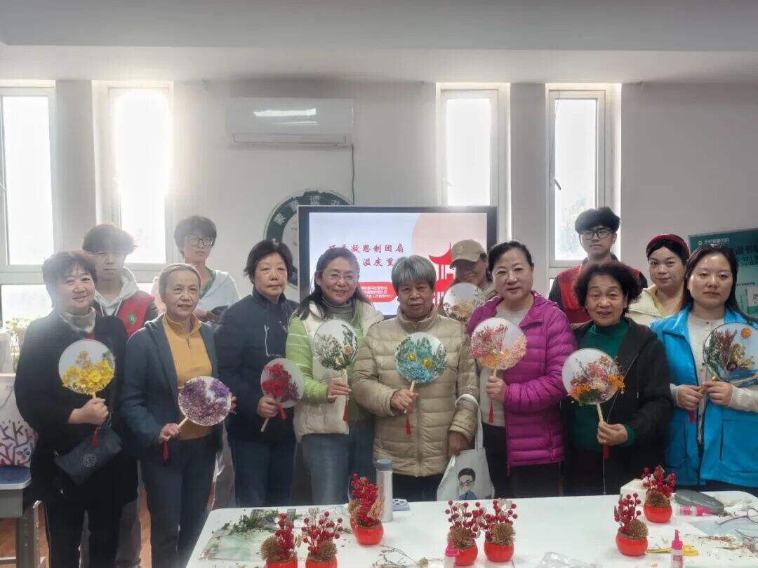 制作过程中,老人们有的仔细挑选干花,搭配出层次分明的花艺造型;有的小心翼翼涂抹酒精胶,将干花稳稳粘在宫扇上;遇到手法生疏的地方,便主动和身边同伴交流经验,或是向社工、志愿者求助。
