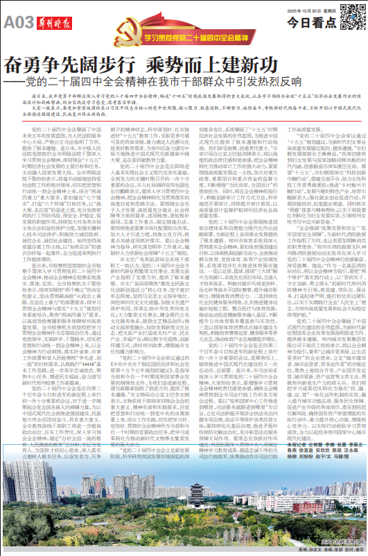 党的二十届四中全会是在向第二个百年奋斗目标进军的新征程上举行的一次十分重要的会议,对于进一步凝聚起全党全国各族人民磅礴力量,为以中国式现代化全面推进强国建设、民族复兴伟业而团结奋斗,具有重大意义。全市教育战线干部职工将进一步提高政治站位、压实工作责任,深入学习领会全会精神,锚定“办好全国一流的教育、人民满意的教育”总目标,牢记为党育人、为国育才的初心使命,深入落实立德树人根本任务,以奋发有为、只争朝夕的精神状态,科学谋划好、扎实推进好“十五五”教育工作,采取更多可感可及的具体举措,着力满足人民群众优质美好教育需求,为郑州在奋力谱写中原大地推进中国式现代化新篇章中挑大梁、走在前贡献教育力量。