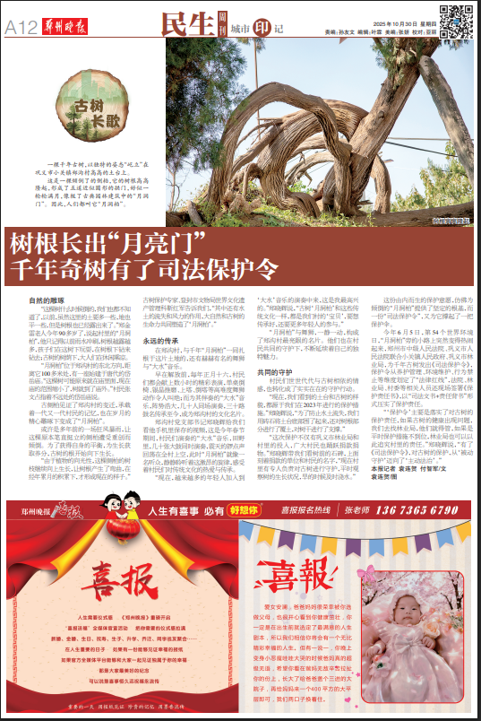 今年6月5日,第54个世界环境日,“月洞柏”旁的小路上突然变得热闹起来,郑州市中级人民法院、巩义市人民法院联合小关镇人民政府、巩义市林业局,为千年古树发出《司法保护令》,保护令从养护管理、环境维护、行为禁止等维度划定了“法律红线”,法院、林业局、村委等相关人员还现场签署《保护责任书》,以“司法文书+责任背书”形式压实了保护责任。