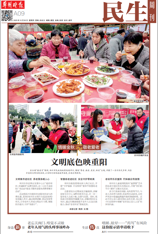 在全国“敬老月”期间,郑州市民政局统筹局属单位,围绕“尊老、敬老、爱老、助老”主题,开展了一系列形式多样、内容丰富的文明实践活动,以实际行动传递城市温度,弘扬文明新风。