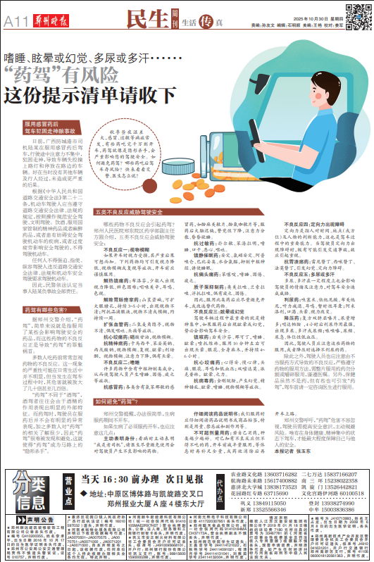 据郑州交警介绍,“药驾”,简单来说就是指服用了某些会影响驾驶安全的药品,而这些药物的不良反应正是导致“药驾”的罪魁祸首。