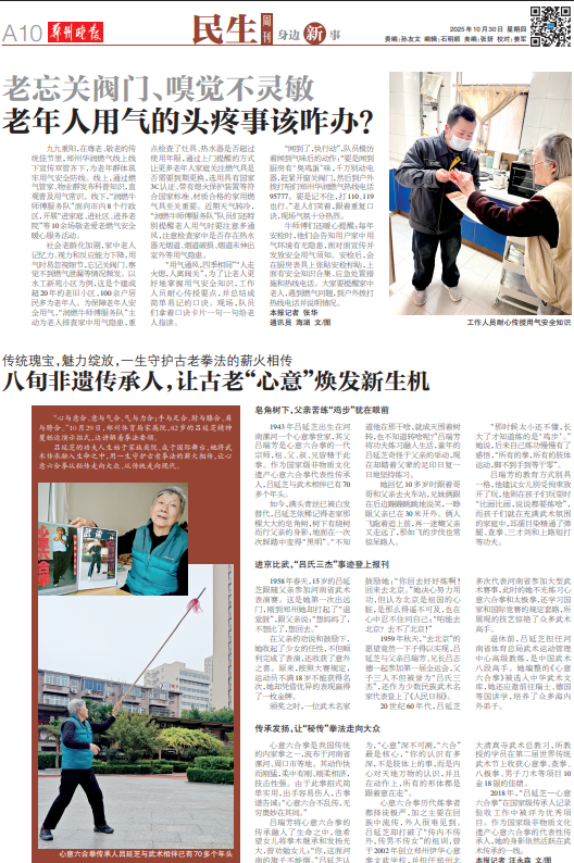 “心与意合、意与气合、气与力合;手与足合、肘与膝合、肩与胯合。”10月29日,郑州体育局家属院,82岁的吕延芝精神矍铄边演示招式,边讲解着拳法要领。