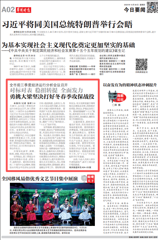安伟指出,前三季度全市经济发展稳中有进、逆势上升、趋势向好。要对标对表党的二十届四中全会精神,围绕坚决实现全年经济社会发展目标,稳扭转提、全面发力,努力为大局全局作贡献,扛牢经济大市挑大梁职责使命。要巩固扩大优势、稳住经济基本盘,突出重点、扭住弱项短板,转变作风、促推态势持续向好,提高创新能力和发展质效,确保“十四五”顺利收官、“十五五”良好开局。