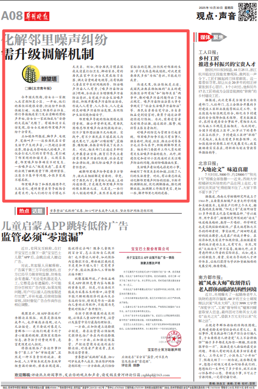 生活噪声看似鸡毛蒜皮的小事,却破坏了邻里关系的和谐,拉低了人们的生活质量。对此,有必要总结成功化解邻里噪声纠纷的经验,不断升级调解机制,优化调解措施,强化调解效能,把调解工作做得更实、更细一些,解开邻里之间的疙瘩。