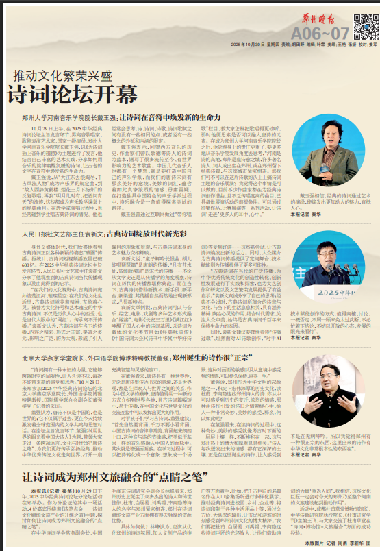 10月29日上午,在2025中华经典诗词论坛主旨发言环节,男高音歌唱家、歌剧表演艺术家、国家一级演员、郑州大学河南音乐学院院长戴玉强,以《为诗词插上音乐的翅膀》为主题进行了发言,他结合自己丰富的艺术实践,分享如何用音乐的旋律唤醒沉睡的诗句,让古老的文字在音符中焕发新的生命力。