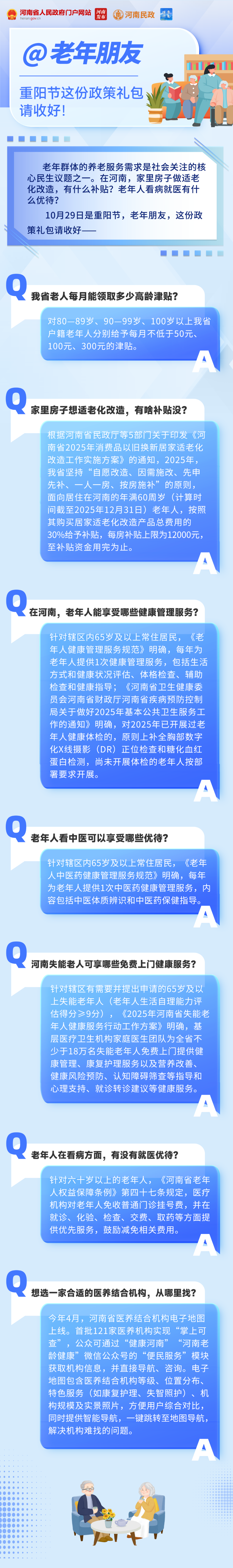 老年群体的养老服务需求是社会关注的核心民生议题之一。在河南,家里房子做适老化改造有什么补贴?老年人看病就医有什么优待?10月是全国敬老月,10月29日又是重阳节,老年朋友,这份政策礼包请收好——