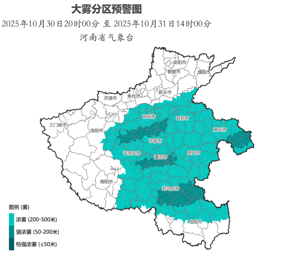河南省气象台10月30日16时30分继续发布大雾黄色预警:预计30日20时至31日14时,新乡东部、洛阳东部、郑州、开封、商丘、平顶山、许昌、周口、漯河、南阳东部、驻马店、信阳北部部分县(市、区)将出现能见度低于500米的浓雾,其中郑州南部、平顶山北部、许昌北部、商丘东部、漯河、驻马店南部部分县(市、区)有能见度低于200米的强浓雾,局部能见度低于50米。请注意防范,上述地区的相邻县(市、区)也需关注。