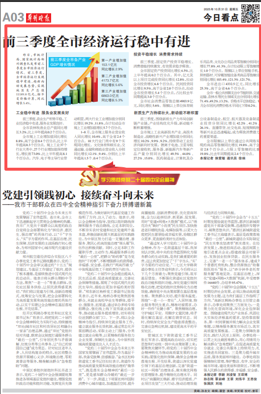 前三季度,围绕新质生产力布局创新链产业链,产业结构优化升级,新动能不断积蓄增强。