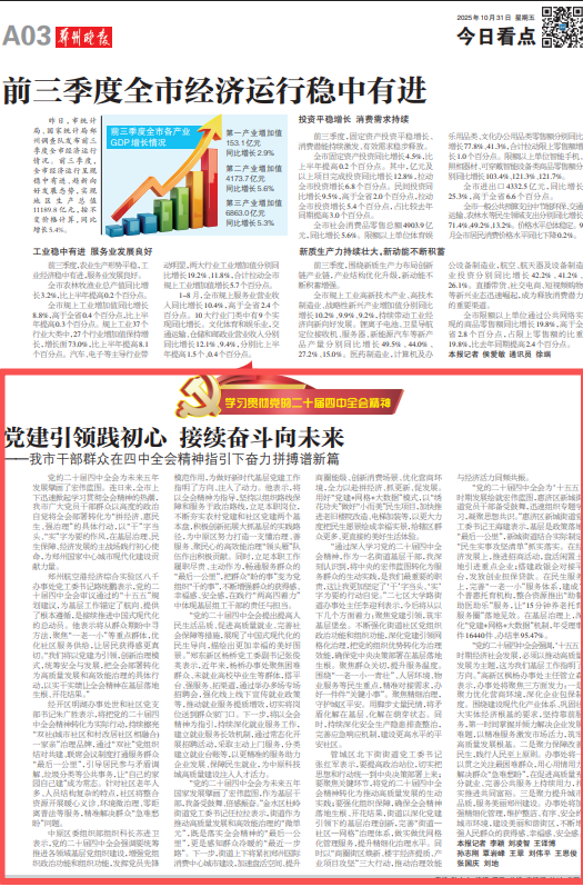 党的二十届四中全会为未来五年发展擘画了宏伟蓝图。连日来,全市上下迅速掀起学习贯彻全会精神的热潮,我市广大党员干部群众以高度的政治自觉将全会部署转化为“拼经济、惠民生、强治理”的具体行动,以“干”字当头、“实”字为要的作风,在基层治理、民生保障、经济发展的主战场践行初心使命,为郑州国家中心城市现代化建设贡献力量。