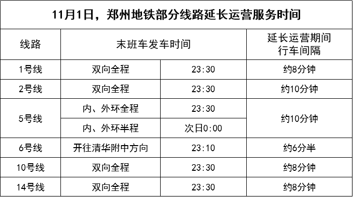 11月1日,郑州奥林匹克体育中心将举行大型活动,郑州地铁部分线路延长运营服务时间。