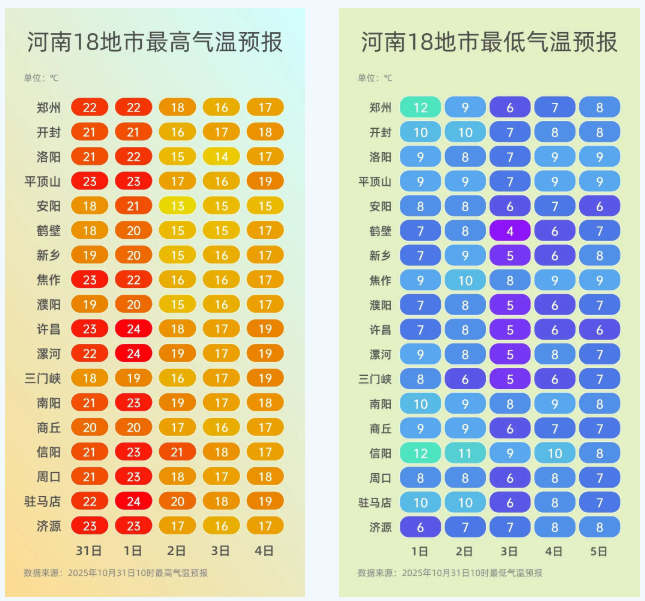 据河南气象,今天夜里到明天上午,北部、东部、南部部分县(市、区)有雾,局地强浓雾。在两股弱冷空气频繁影响之下,今后五天我省气温将有小幅波动,比较明显的降温出现在本周日,最高气温预计相比明天(11月1日)有4℃~6℃的下降。明天夜里到11月2日白天,全省偏北风3到4级,北部、西南部阵风5到6级。