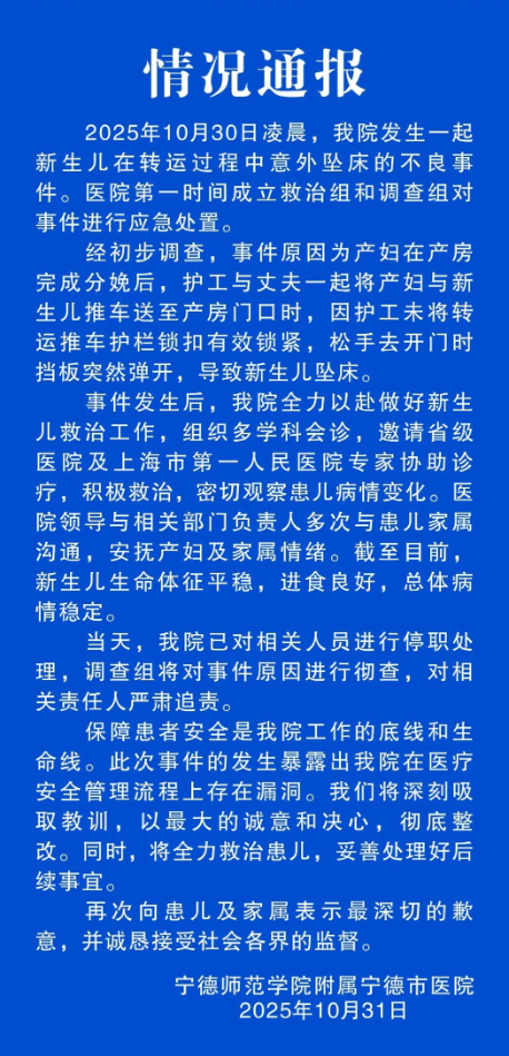 10月30日清晨,福建宁德师范学院附属宁德市医院,一名刚出生的新生儿在转运中从推车坠落,头部骨折多部位出血,护工系劳务派遣。对此,10月31日,该院通报:因护工未将转运推车护栏锁扣锁紧致挡板弹开,已对相关人员进行停职处理。目前,新生儿生命体征平稳,进食良好,总体病情稳定。