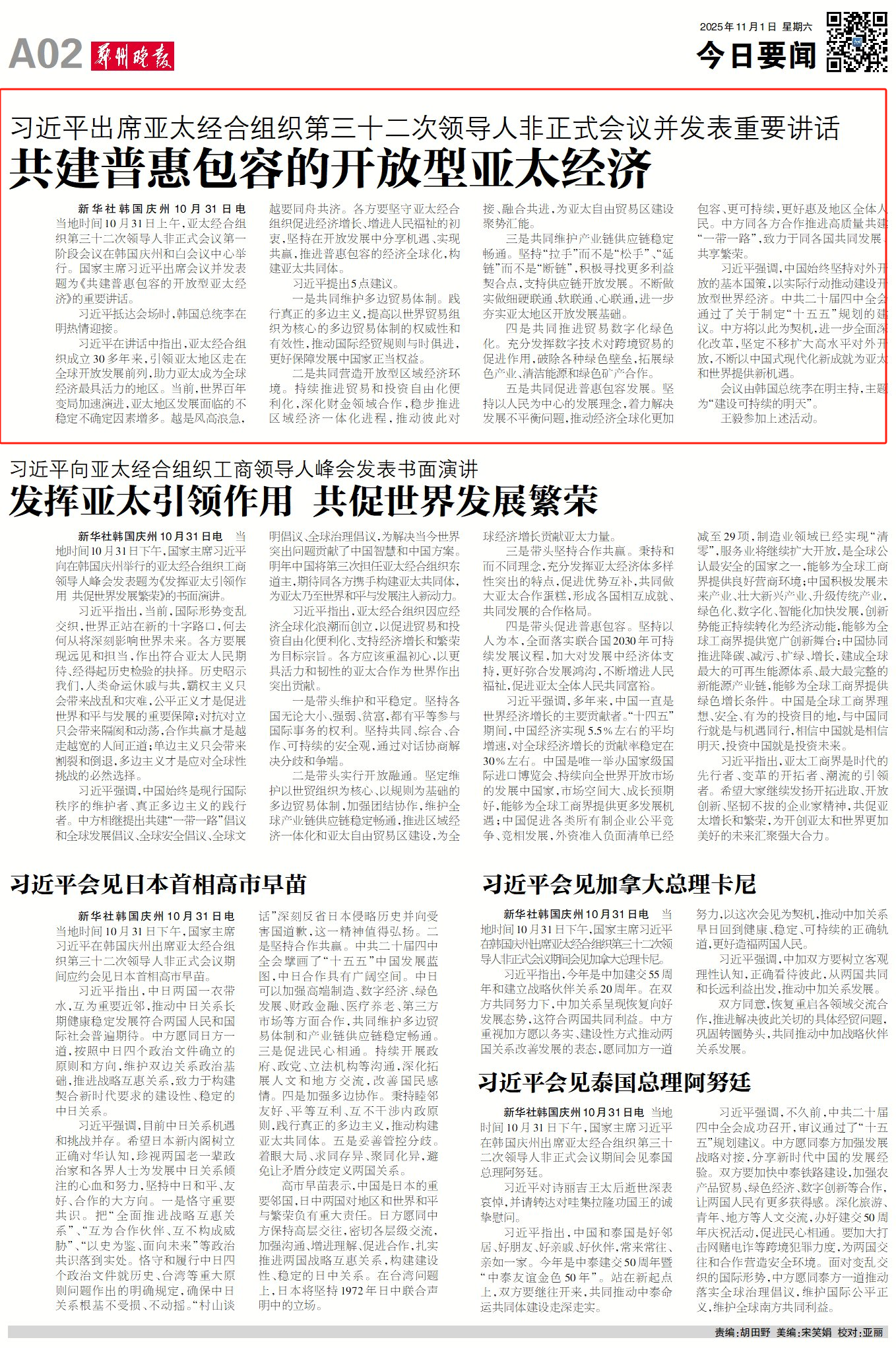 习近平强调,中国始终坚持对外开放的基本国策,以实际行动推动建设开放型世界经济。中共二十届四中全会通过了关于制定“十五五”规划的建议。中方将以此为契机,进一步全面深化改革,坚定不移扩大高水平对外开放,不断以中国式现代化新成就为亚太和世界提供新机遇。