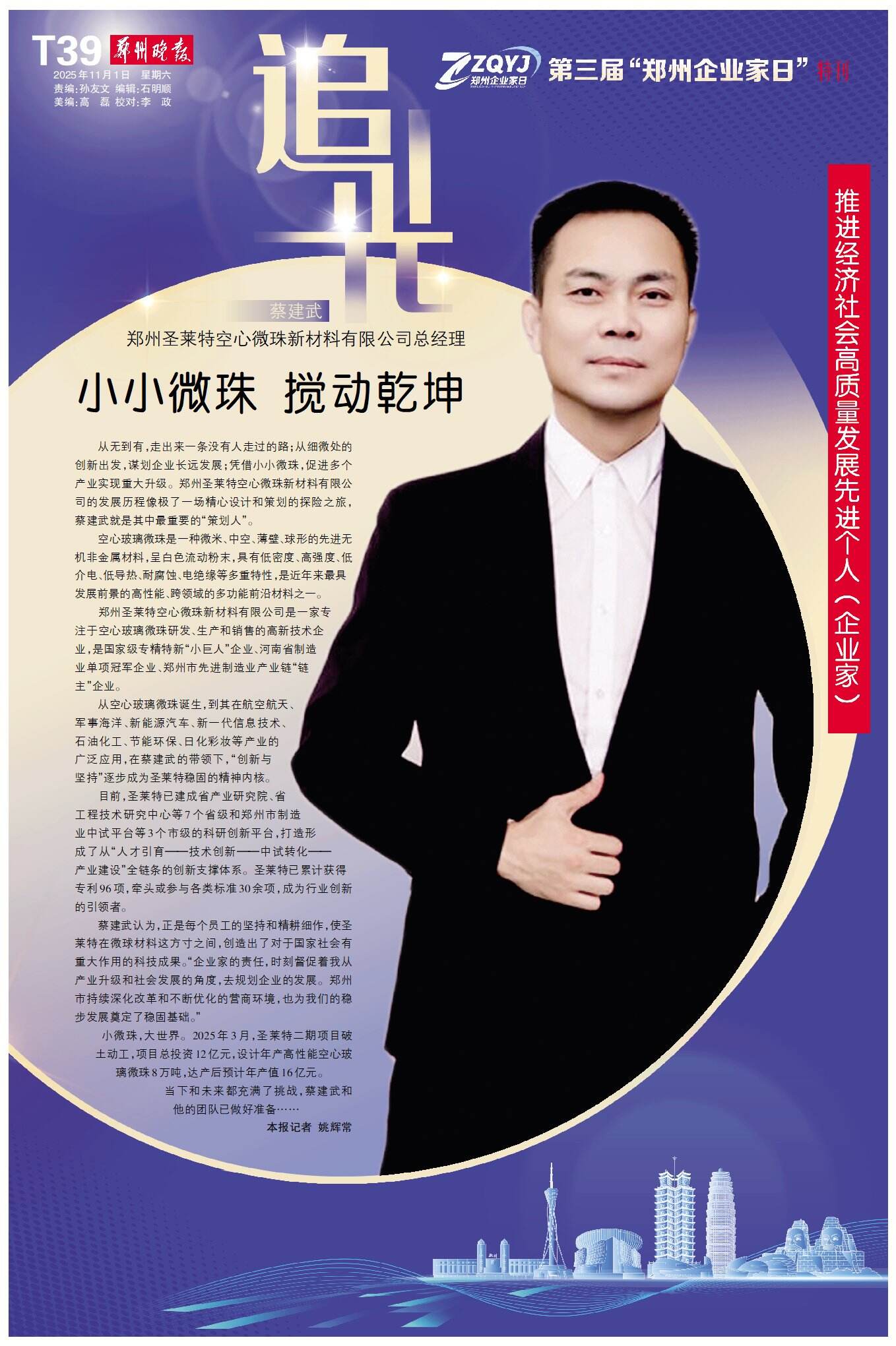 蔡建武认为,正是每个员工的坚持和精耕细作,使圣莱特在微球材料这方寸之间,创造出了对于国家社会有重大作用的科技成果。“企业家的责任,时刻督促着我从产业升级和社会发展的角度,去规划企业的发展。郑州市持续深化改革和不断优化的营商环境,也为我们的稳步发展奠定了稳固基础。”