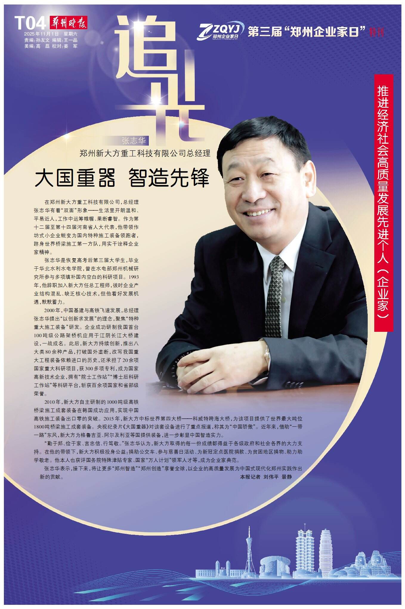 在郑州新大方重工科技有限公司,总经理张志华有着“双面”形象——生活里开朗温和、平易近人,工作中运筹帷幄、果断睿智。作为第十二届至第十四届河南省人大代表,他带领作坊式小企业蜕变为国内特种施工装备领跑者,跻身世界桥梁施工第一方队,用实干诠释企业家精神。