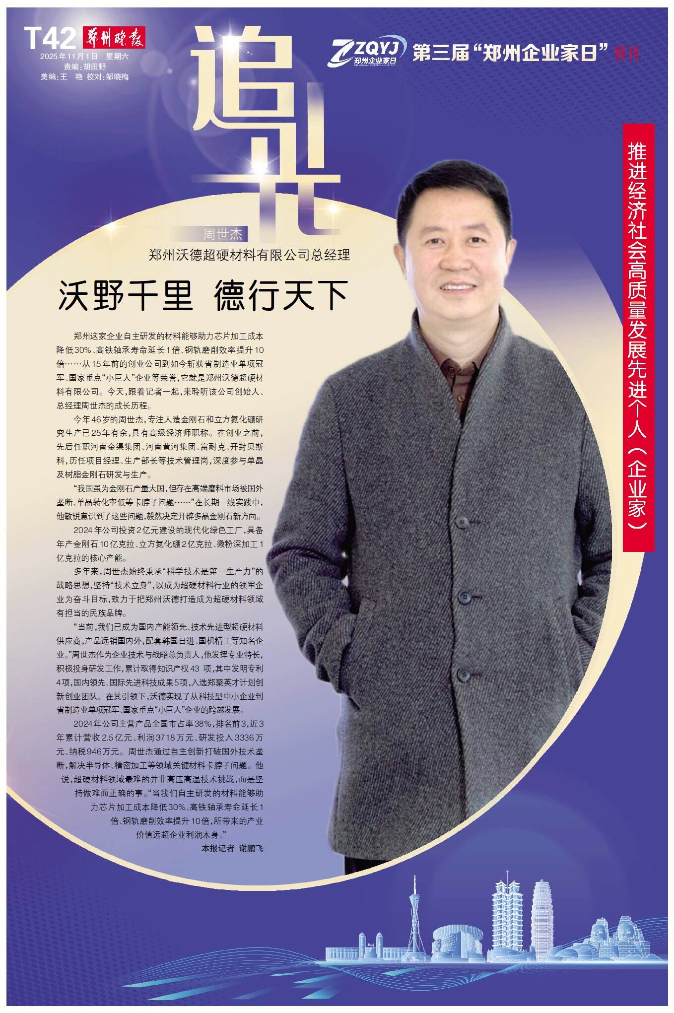 郑州这家企业自主研发的材料能够助力芯片加工成本降低30%、高铁轴承寿命延长1倍、钢轨磨削效率提升10 倍……从15年前的创业公司到如今斩获省制造业单项冠军、国家重点“小巨人”企业等荣誉,它就是郑州沃德超硬材料有限公司。今天,跟着记者一起,来聆听该公司创始人、总经理周世杰的成长历程。