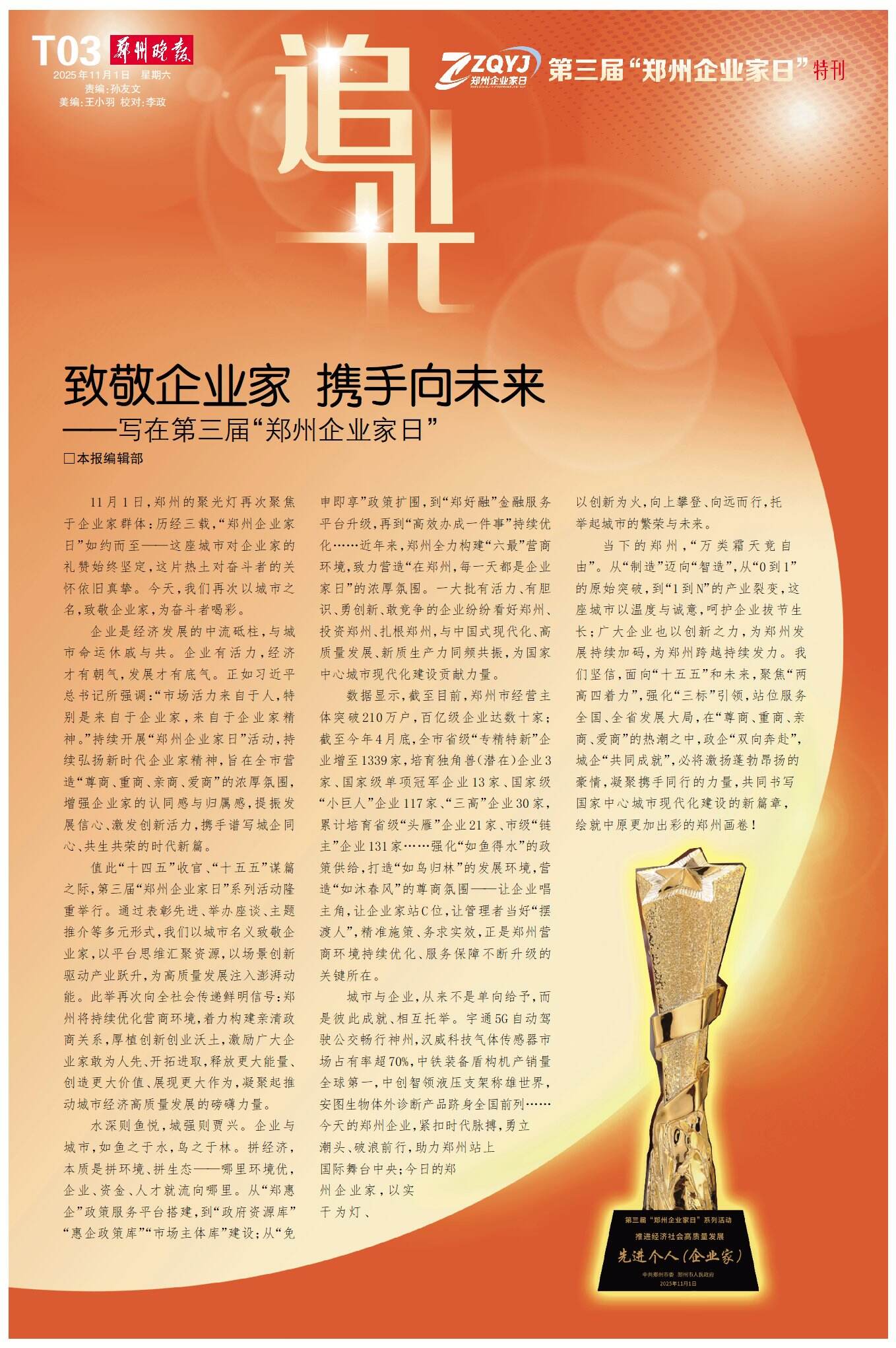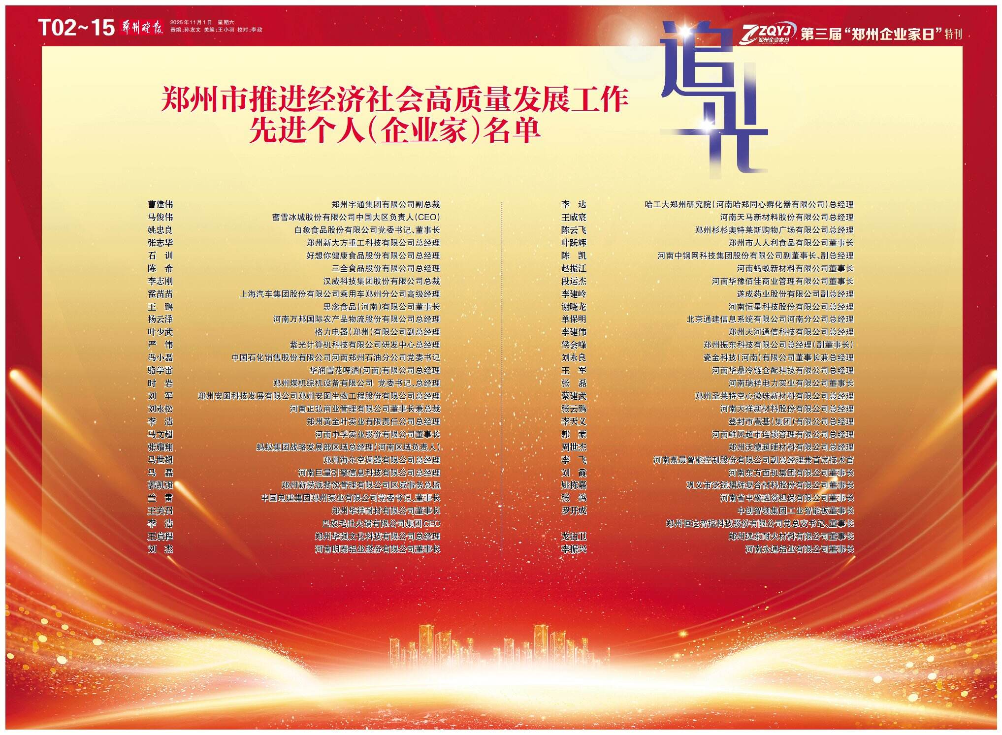 值此“十四五”收官、“十五五”谋篇之际,第三届“郑州企业家日”系列活动隆重举行。通过表彰先进、举办座谈、主题推介等多元形式,我们以城市名义致敬企业家,以平台思维汇聚资源,以场景创新驱动产业跃升,为高质量发展注入澎湃动能。此举再次向全社会传递鲜明信号:郑州将持续优化营商环境,着力构建亲清政商关系,厚植创新创业沃土,激励广大企业家敢为人先、开拓进取,释放更大能量、创造更大价值、展现更大作为,凝聚起推动城市经济高质量发展的磅礴力量。