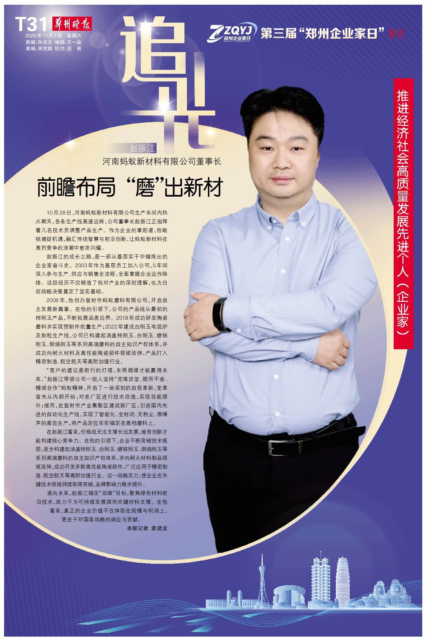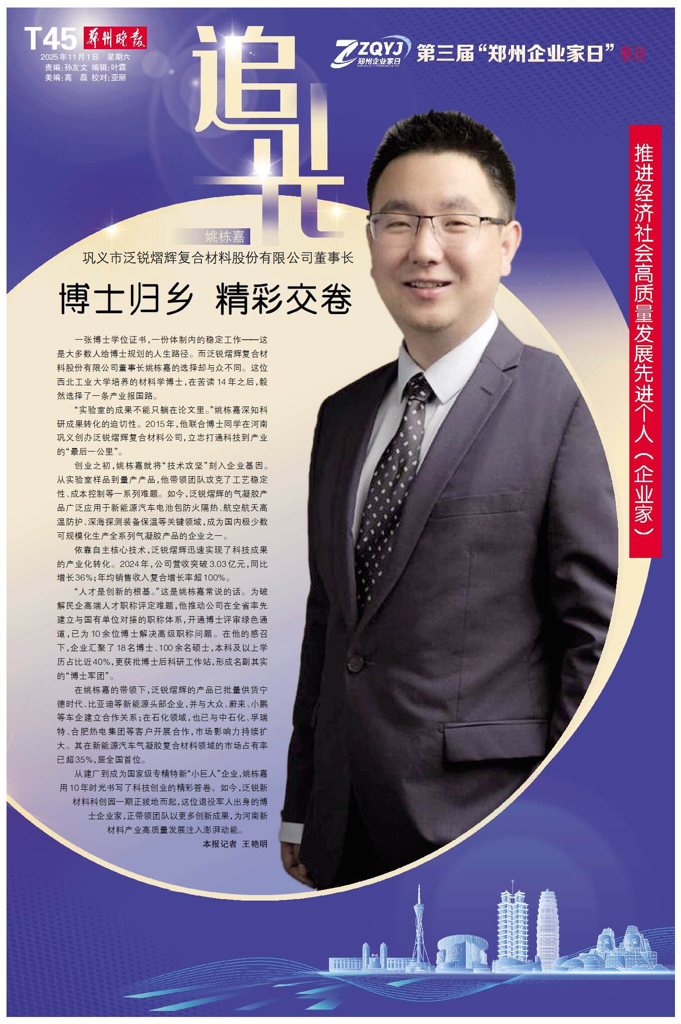 从建厂到成为国家级专精特新“小巨人”企业,姚栋嘉用10年时光书写了科技创业的精彩答卷。如今,泛锐新材料科创园一期正拔地而起,这位退役军人出身的博士企业家,正带领团队以更多创新成果,为河南新材料产业高质量发展注入澎湃动能。