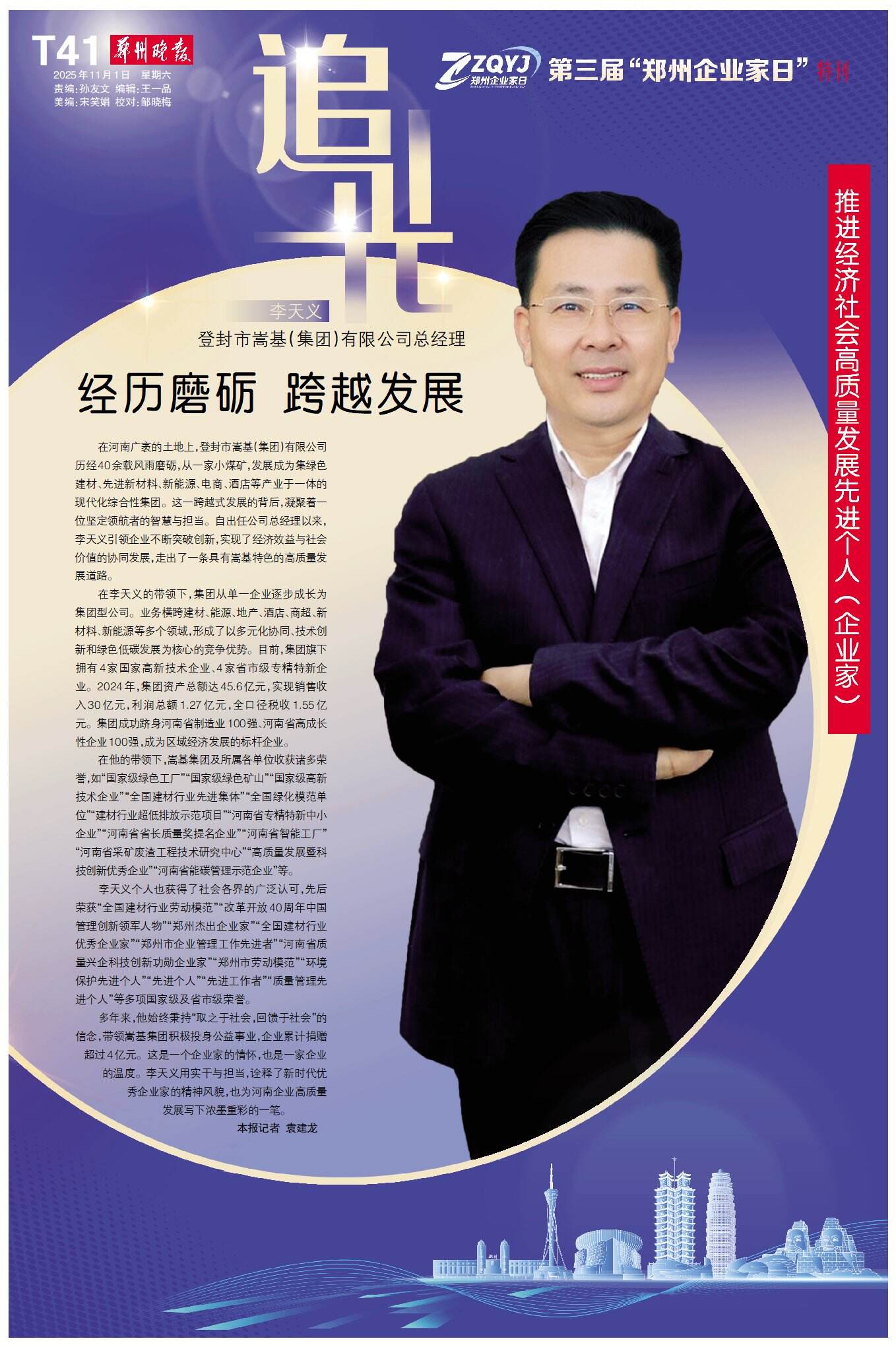 多年来,他始终秉持“取之于社会,回馈于社会”的信念,带领嵩基集团积极投身公益事业,企业累计捐赠超过4亿元。这是一个企业家的情怀,也是一家企业的温度。李天义用实干与担当,诠释了新时代优秀企业家的精神风貌,也为河南企业高质量发展写下浓墨重彩的一笔。