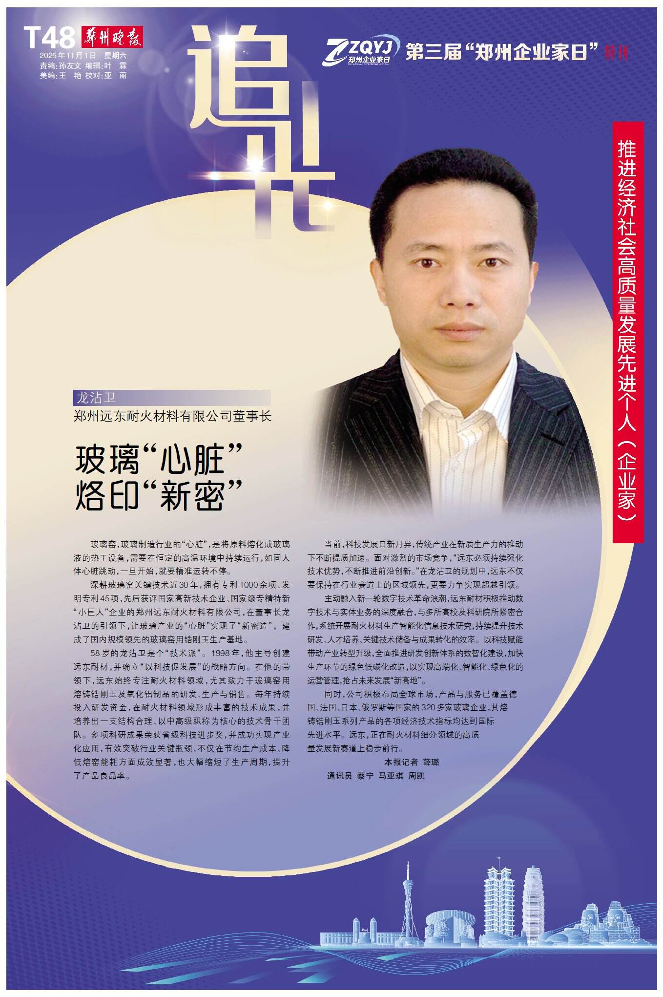 深耕玻璃窑关键技术近30年,拥有专利1000余项、发明专利45项,先后获评国家高新技术企业、国家级专精特新“小巨人”企业的郑州远东耐火材料有限公司,在董事长龙沾卫的引领下,让玻璃产业的“心脏”实现了“新密造”, 建成了国内规模领先的玻璃窑用锆刚玉生产基地。